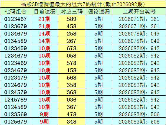 福彩3D七码遗漏组六分析(第2002001期-第2026092期)